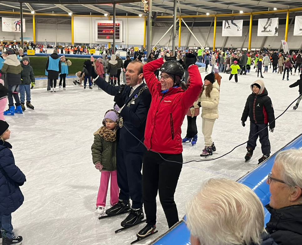 Ook de aanwezigheid van de loco-burgemeester was een groot succes. Hij schaatste met burgemeestersketen en chic pak vrolijk zijn rondjes.