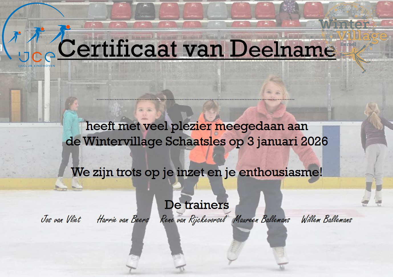 Bijna honderd Eerselse kinderen hebben met veel plezier deelgenomen aan de Wintervillage schaatslessen verzorgd door IJCE. Trainers Maureen, Jos en Willem kijken met trots terug op wat de kinderen op 3 zaterdagen hebben geleerd. Alle deelnemertjes mochten een certificaat van deelname in ontvangst nemen als tastbare herinnering. Zo was IJCE dus ook lokaal zichtbaar en wie weet mogen we binnenkort de talenten uit Eersel op het IJssportcentrum begroeten.